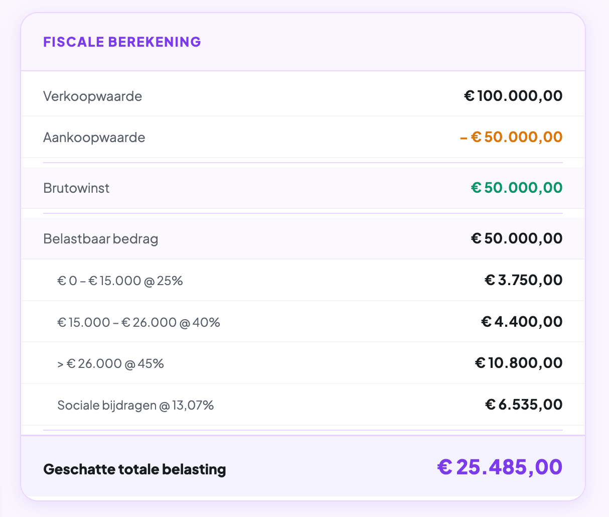 - Beroepsmatig (progressief tot 50% + sociale bijdragen)