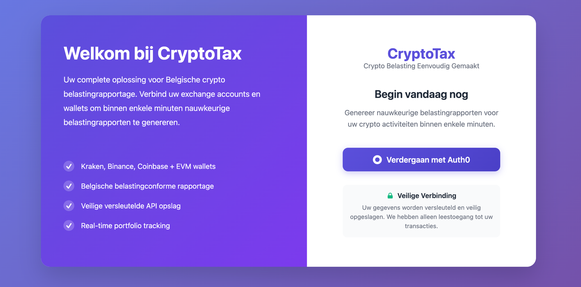 Ga terug naar cryptotax.be en log in met je e-mailadres en wachtwoord. Je komt nu op je persoonlijk dashboard.